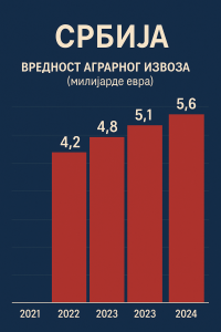 Укупна вредност аграрног извоза у 2024. години износила је 5,14 милијарди евра, што представља раст од 9,5 одсто у односу на 2023. годину. Са друге стране, увоз пољопривредно-прехрамбених производа износио је 3,94 милијарде евра, чиме је остварен трговински суфицит од 1,2 милијарде евра.